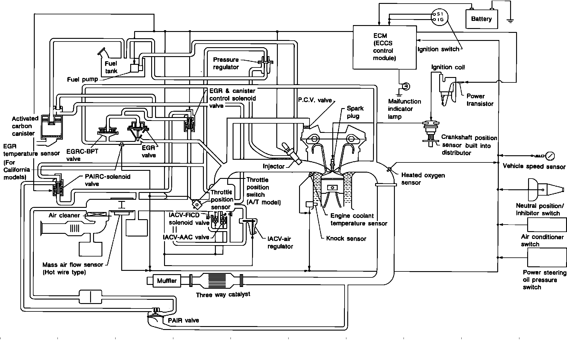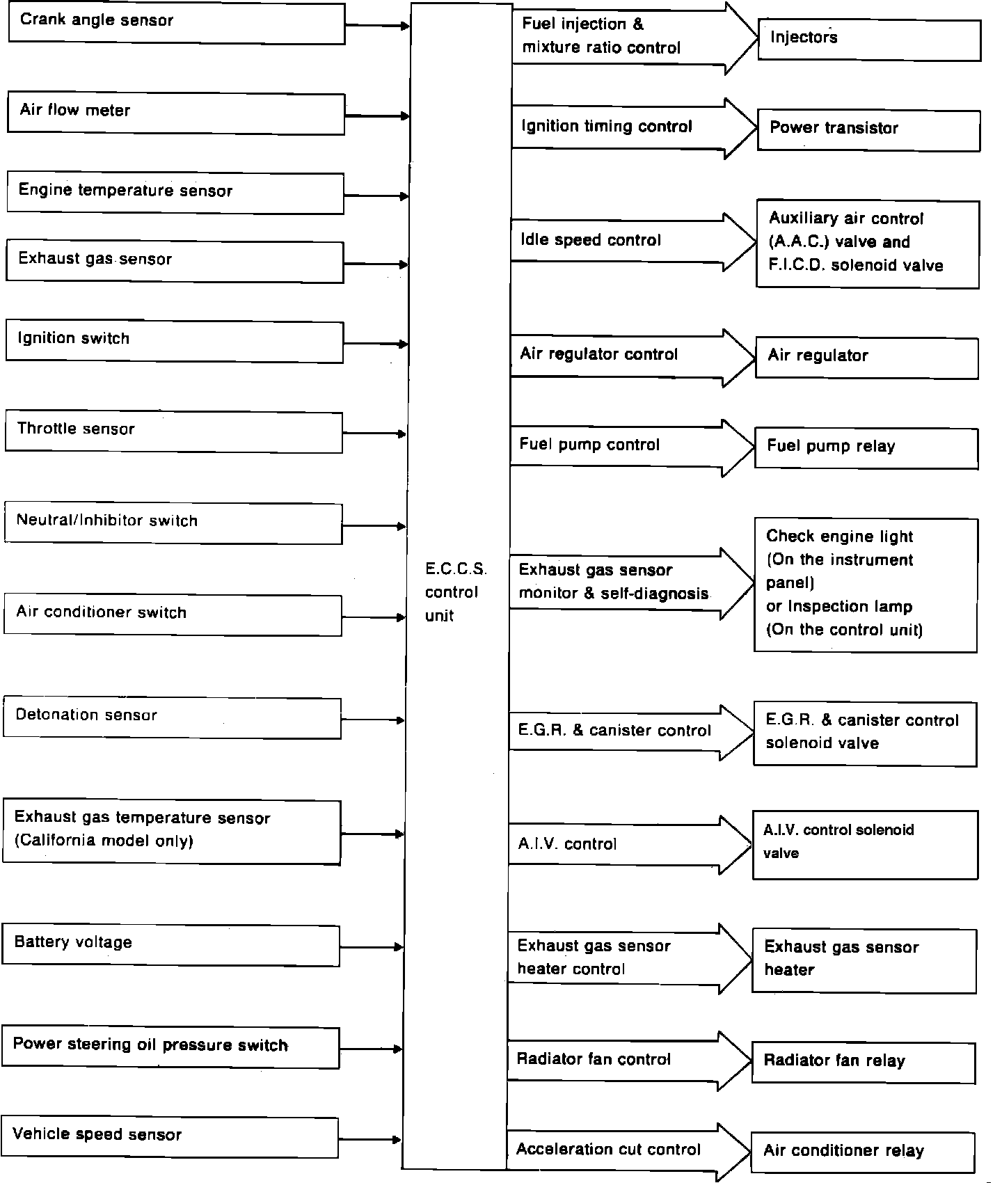 The term used by Nissan to identify the Computerized Engine Control System is ECCS (Electronic Concentrated Engine Control System). The system is comprised of an ECM (electronic control unit/module), sensors (input devices) and actuators (output devices). The ECCS system also has built-in Self-Diagnostics and a Fail-Safe system.
