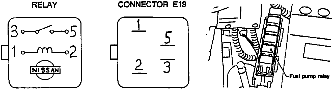 1. Note that the schematic on the fuel pump relay is rotated 90 degrees from the orientation of the fuel pump relay terminals in connector E19 (see diagram shown):