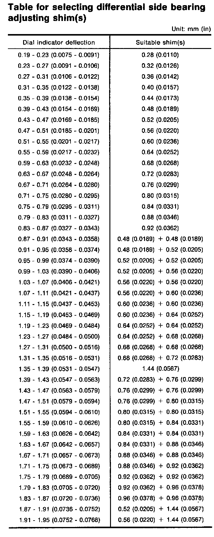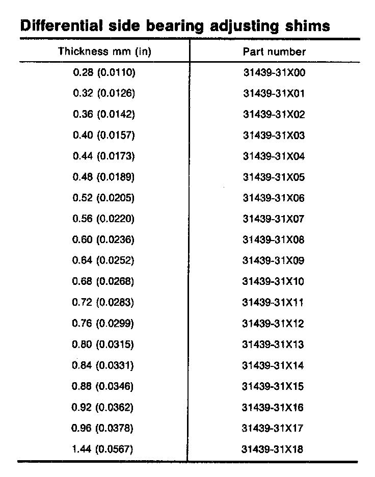 Table For Selecting Differential Side Bearing Adjusting Shim(s)