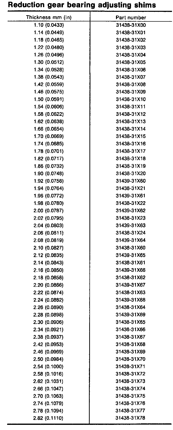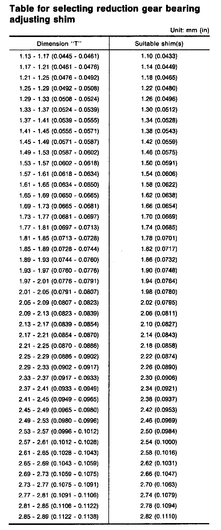 Table For Selecting Reduction Gear Bearing Adjusting Shim