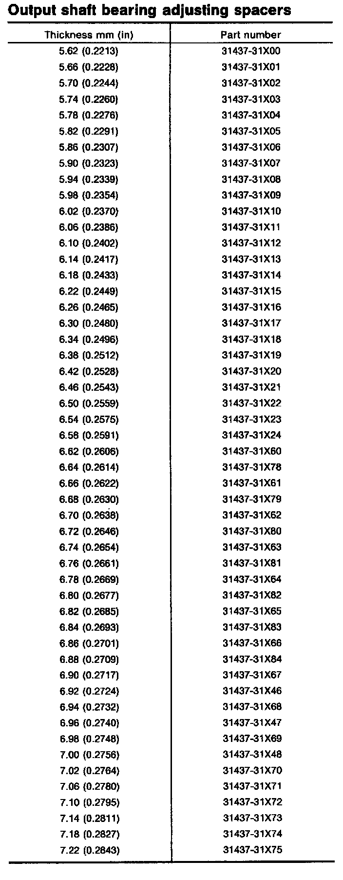 Table For Selecting Output Shaft Bearing Adjusting Spacer: