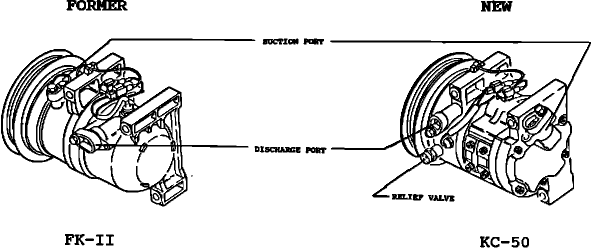 For the 1993 model year, the compressor will be changed from the type FK-II to type KC-50. Resulting from this compressor change, the high and low hoses, as well as the compressor bracket, will also be changed.