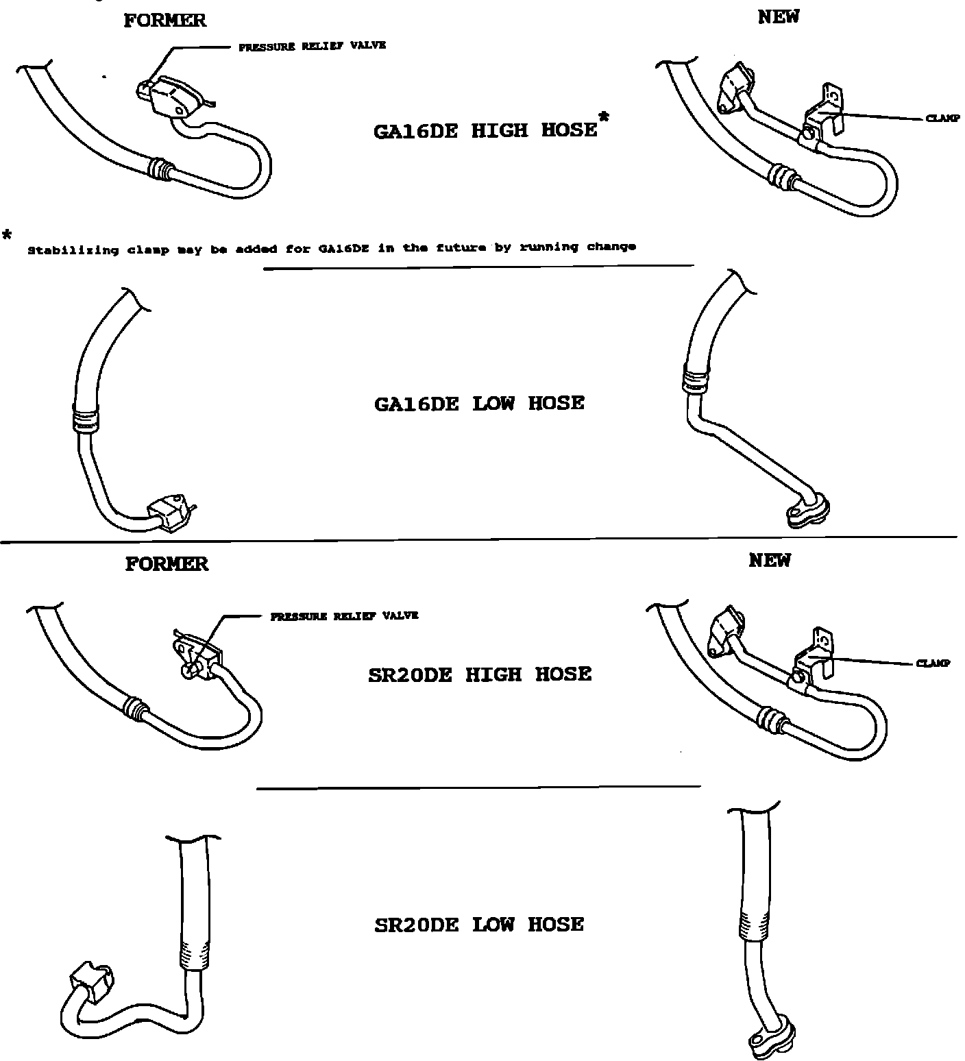 The original GA16DE high hose (92490-64Y00) should be serviced with the revised high hose (92490-64Y01) and stabilizing clamp (92550-58Y00).