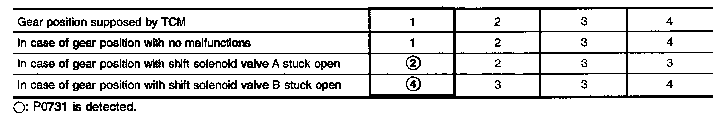 This malfunction will be caused when either shift solenoid valve A is stuck open or shift solenoid valve B is stuck open.