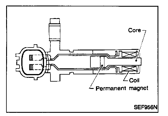 The crankshaft position sensor (OBD) is located on the transmission housing facing the gear teeth (cogs) of the flywheel or drive plate. It detects the fluctuation of the engine revolution. The sensor consists of a permanent magnet, core and coil. When the engine is running, the high and low parts of the teeth cause the gap with the sensor to change.