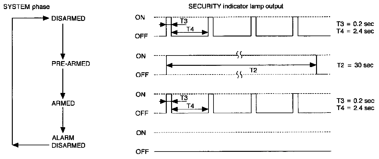 After about 30 seconds, the system automatically shifts into the "armed" phase (the system is set). (The security indicator lamp blinks every 2.6 seconds.)