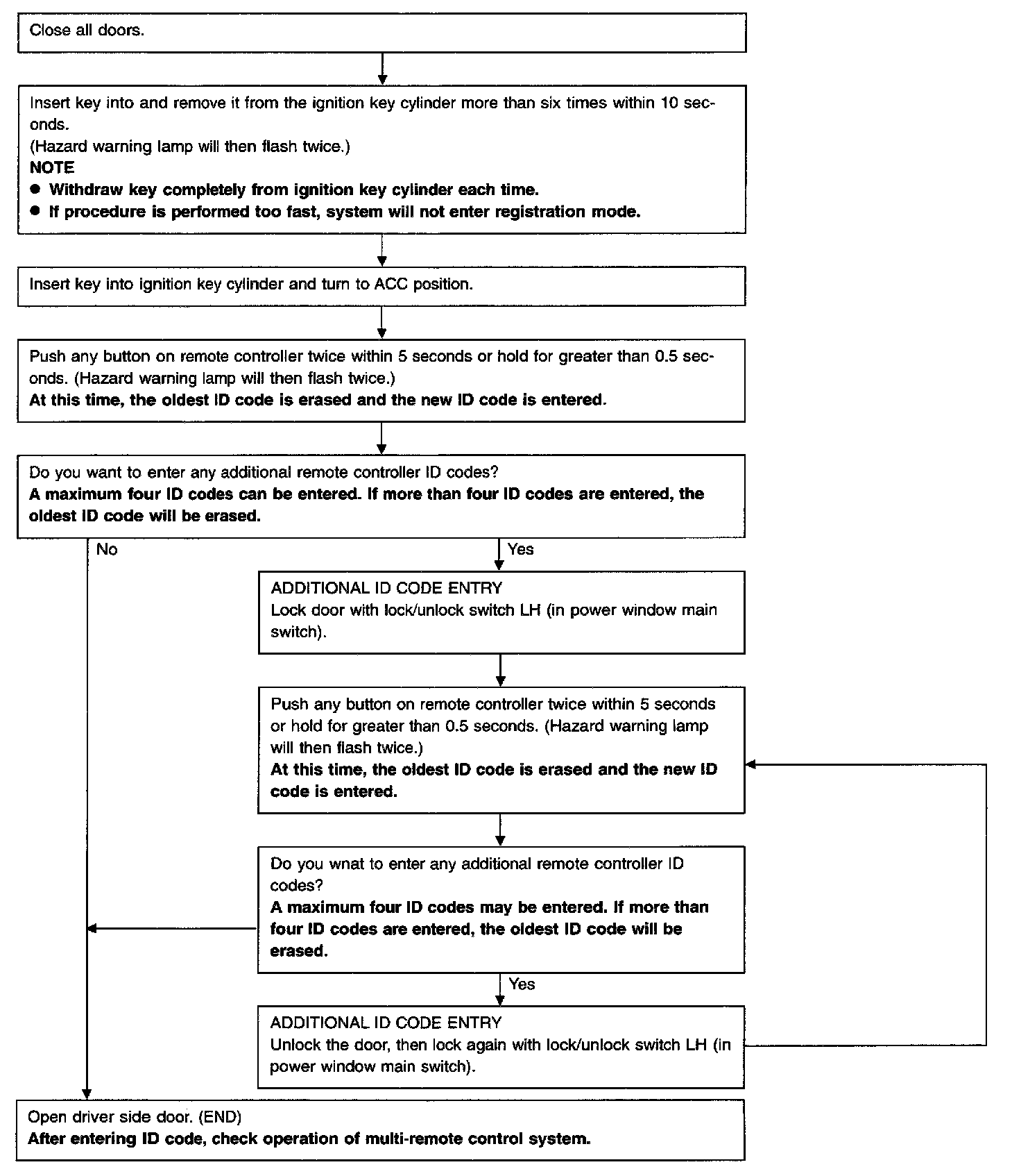 - If a remote controller is lost, the ID code of the lost remote controller must be erased to prevent unauthorized use. Specific ID code can be erased with CONSULT. However, when the ID code of a lost remote controller is not known, all controller ID codes should be erased. After all ID codes are erased, the ID codes of all remaining and/or new remote controllers must be re-registered.