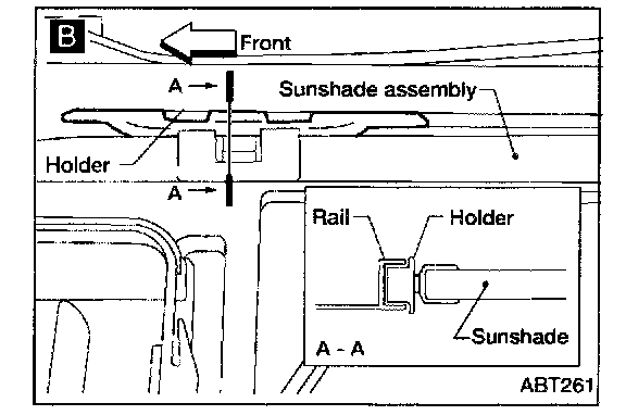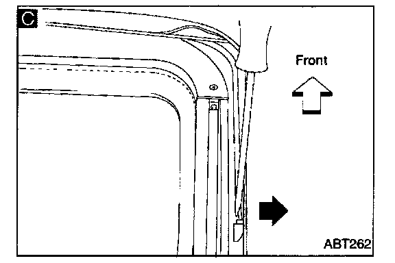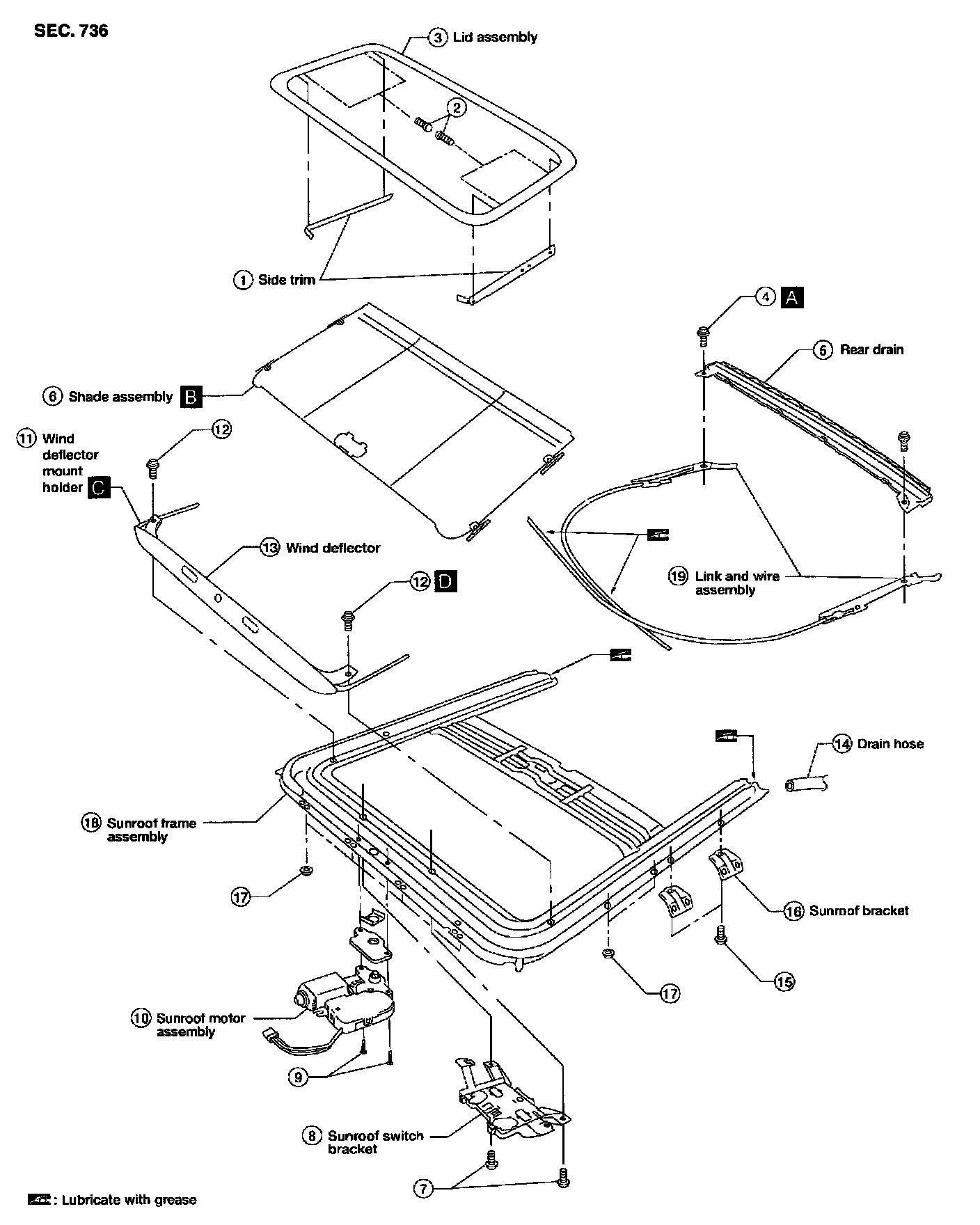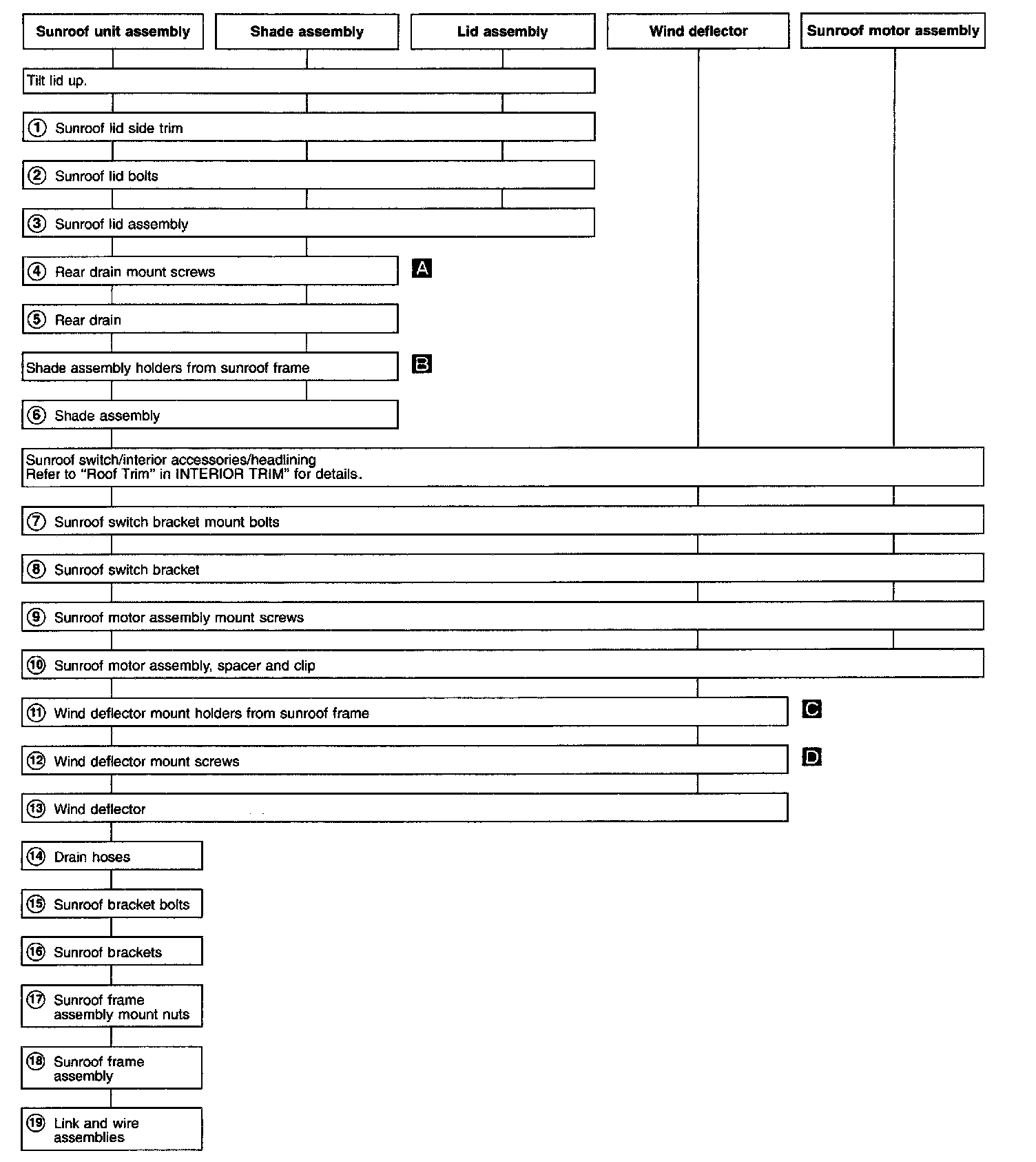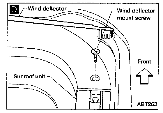 D. Remove wind deflector mount screws from front end of sunroof unit. Remove wind deflector assembly from sunroof frame assembly.