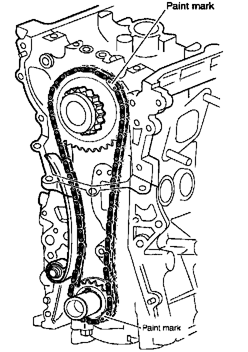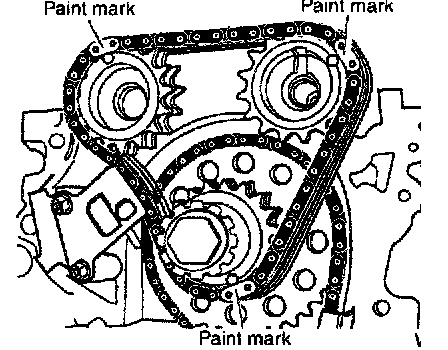 11. Wipe off the links of timing chain next to the timing marks on the sprockets. Put paint marks on the timing chain, matching them with the timing marks on the cam sprockets and idler sprocket.
