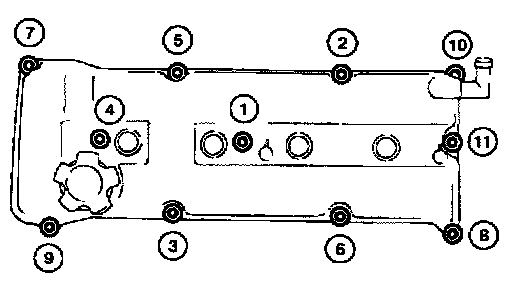 b. Tighten nuts and bolts to (1) to (11) in numerical order to 8 to 11 Nm (0.8 to 1.1 kg-m, 69 to 95 inch lbs.). Install all spark plugs with high-tension cords.