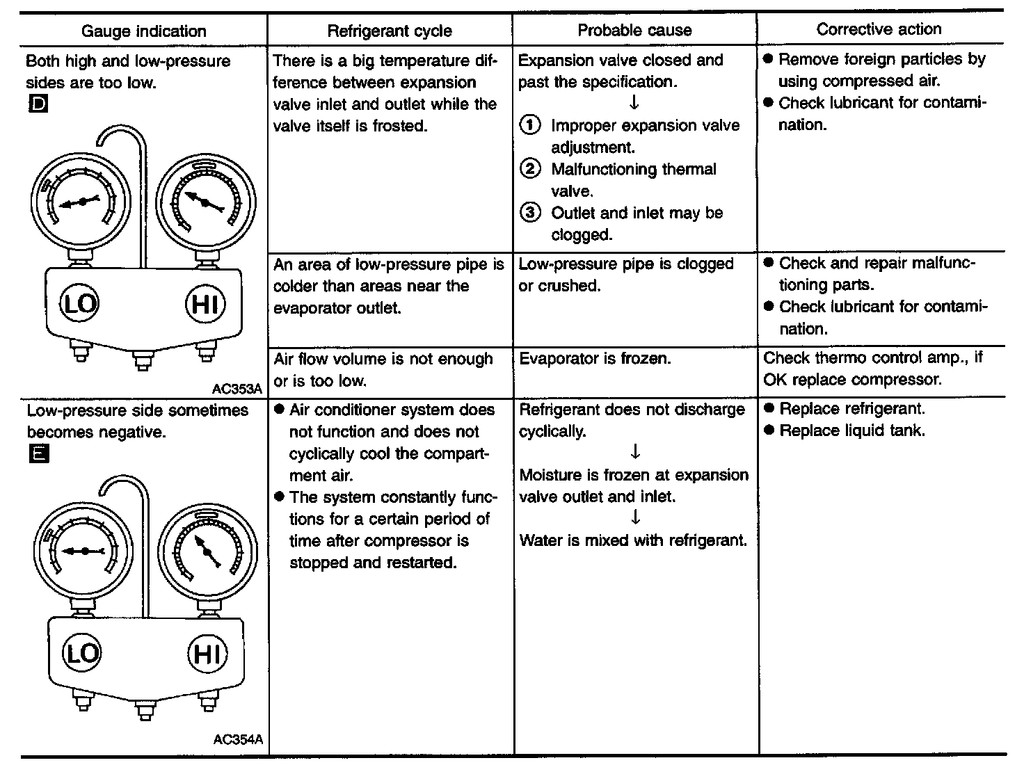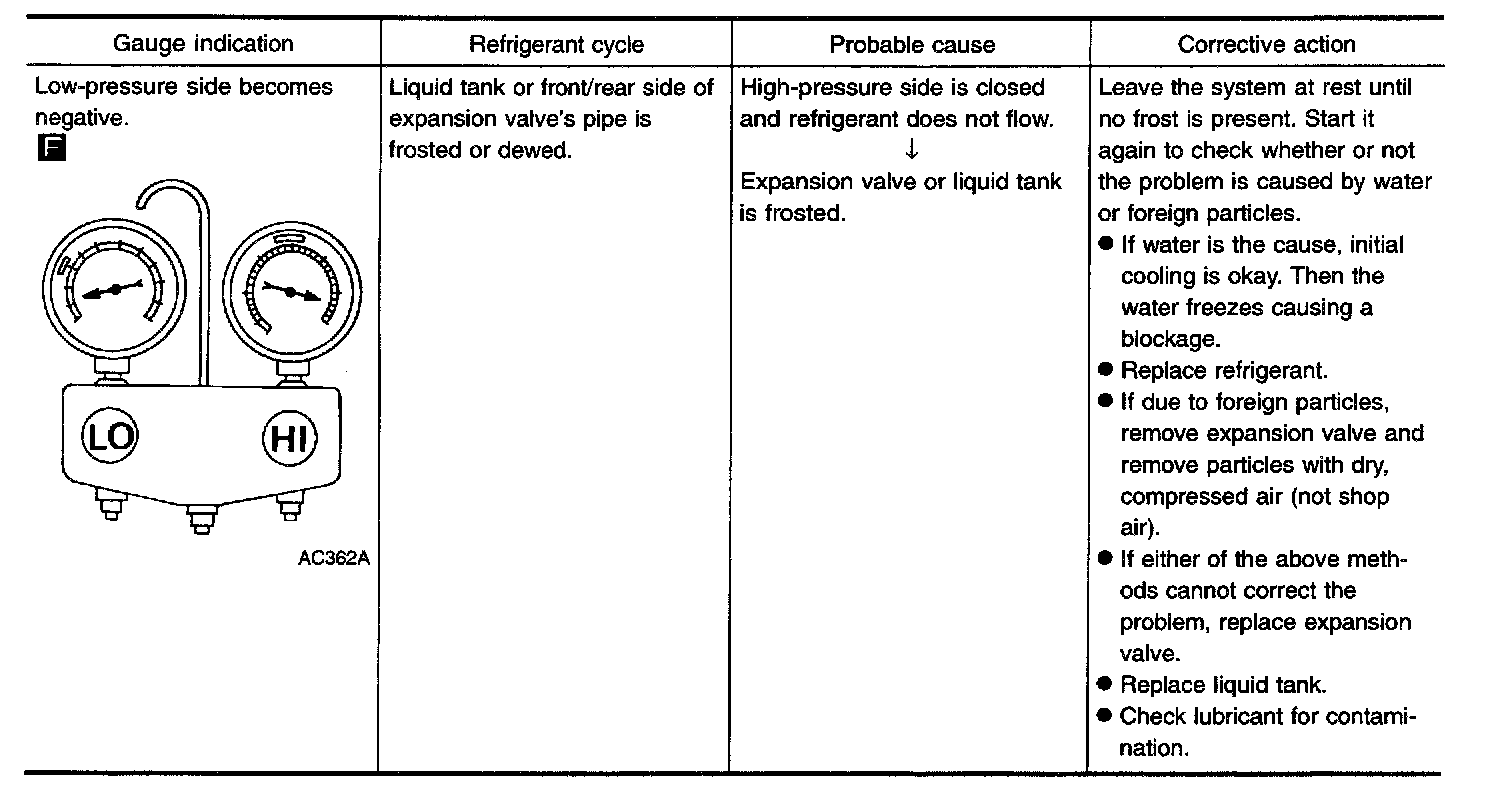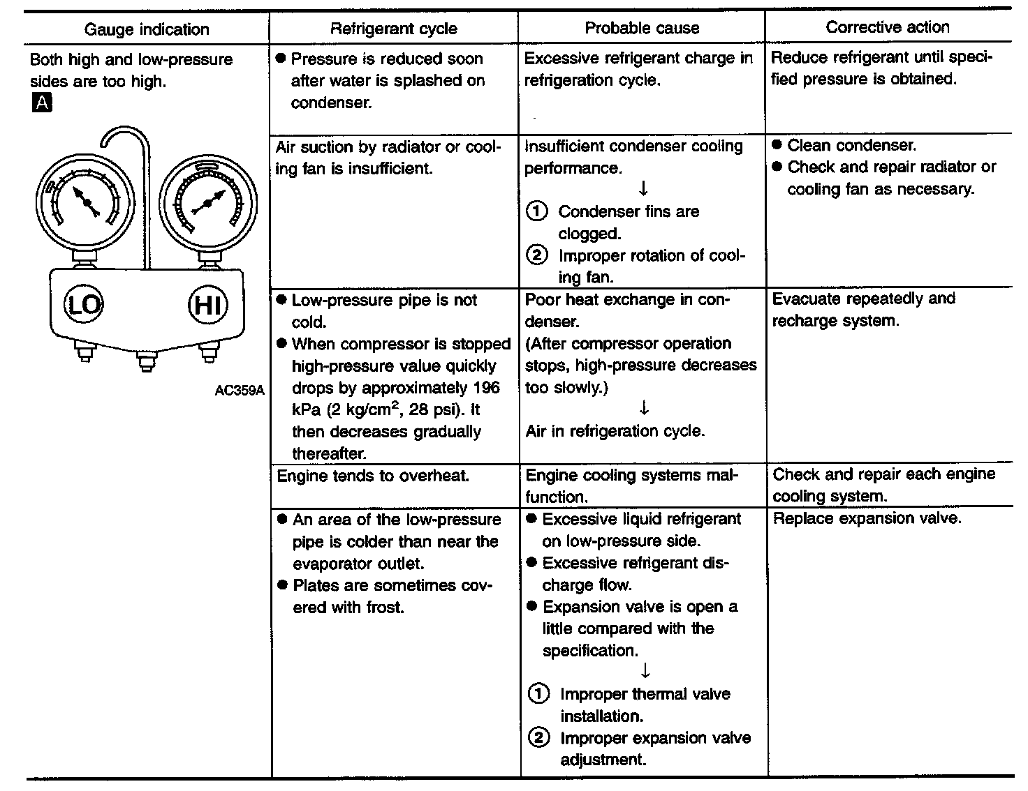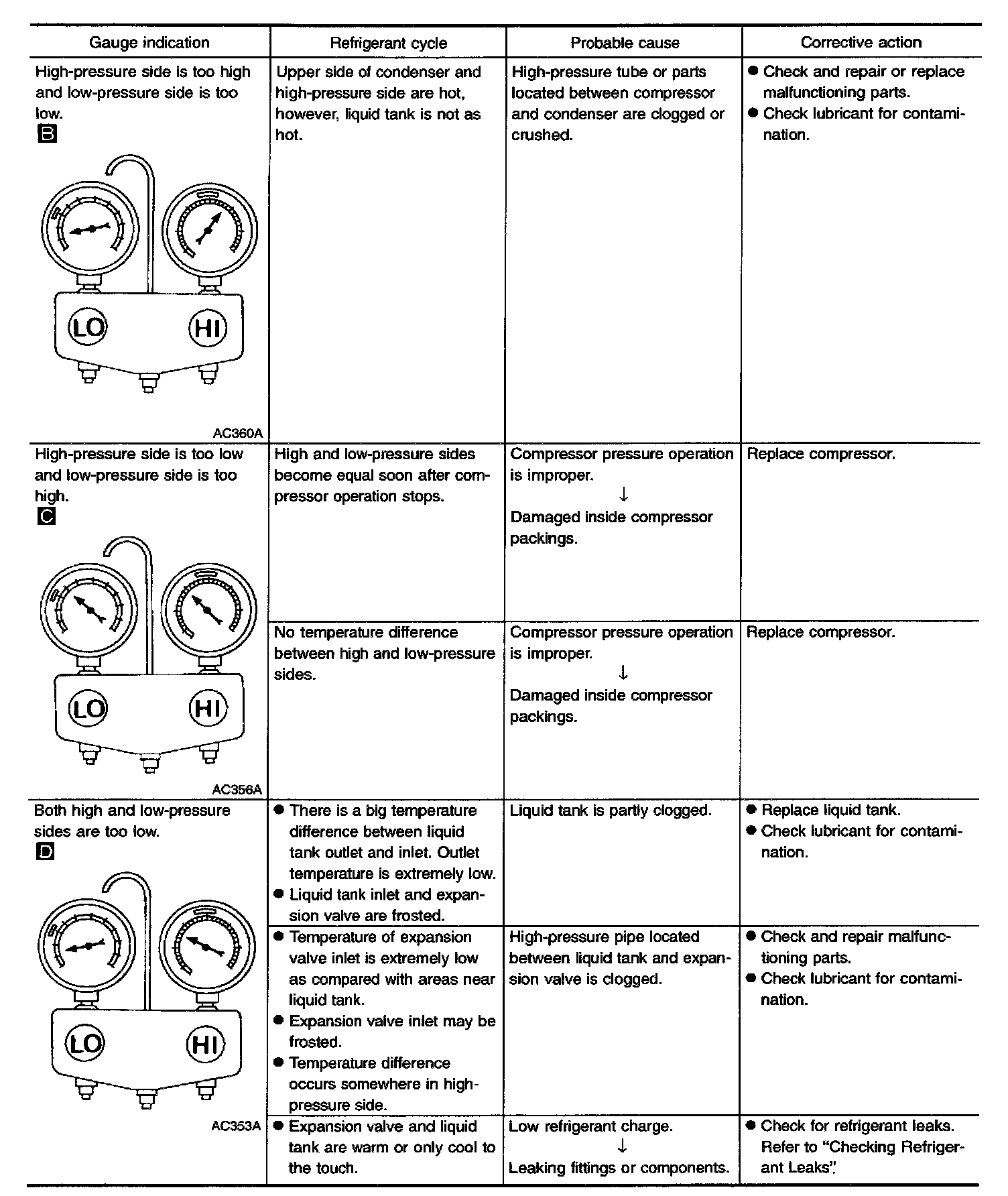 Whenever system's high or low-side pressure is abnormal, diagnose using a manifold gauge. The marker above the gauge scale in the table indicates the standard normal pressure range. Since the standard normal pressure differs from vehicle to vehicle, refer "Ambient air temperature-to-operating pressure table".