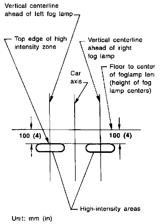 3. Adjust front fog lamps so that the top edge of the high intensity zone is 100 mm (4 in) below the height of the fog lamp centers as shown at left.