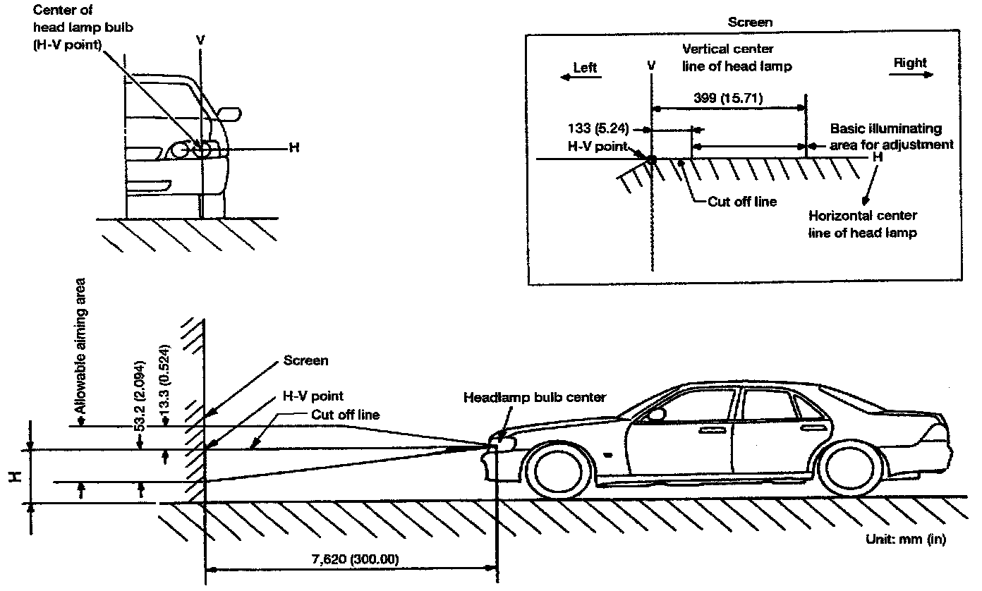 - Basic illuminating area should be within the range shown. Adjust headlamps accordingly.