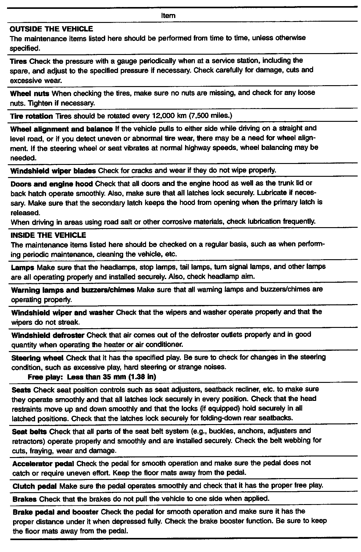 General maintenance includes those items which should be checked during normal day-to-day operation of the vehicle. They are essential if the vehicle is to continue operating properly. The owners can perform checks and inspections themselves or have their NISSAN dealers do them.