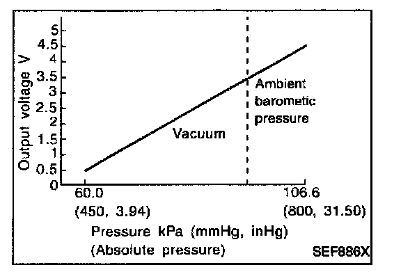 The sensor detects ambient barometric pressure and sends the voltage signal to the ECM. As the pressure increases, the voltage rises.