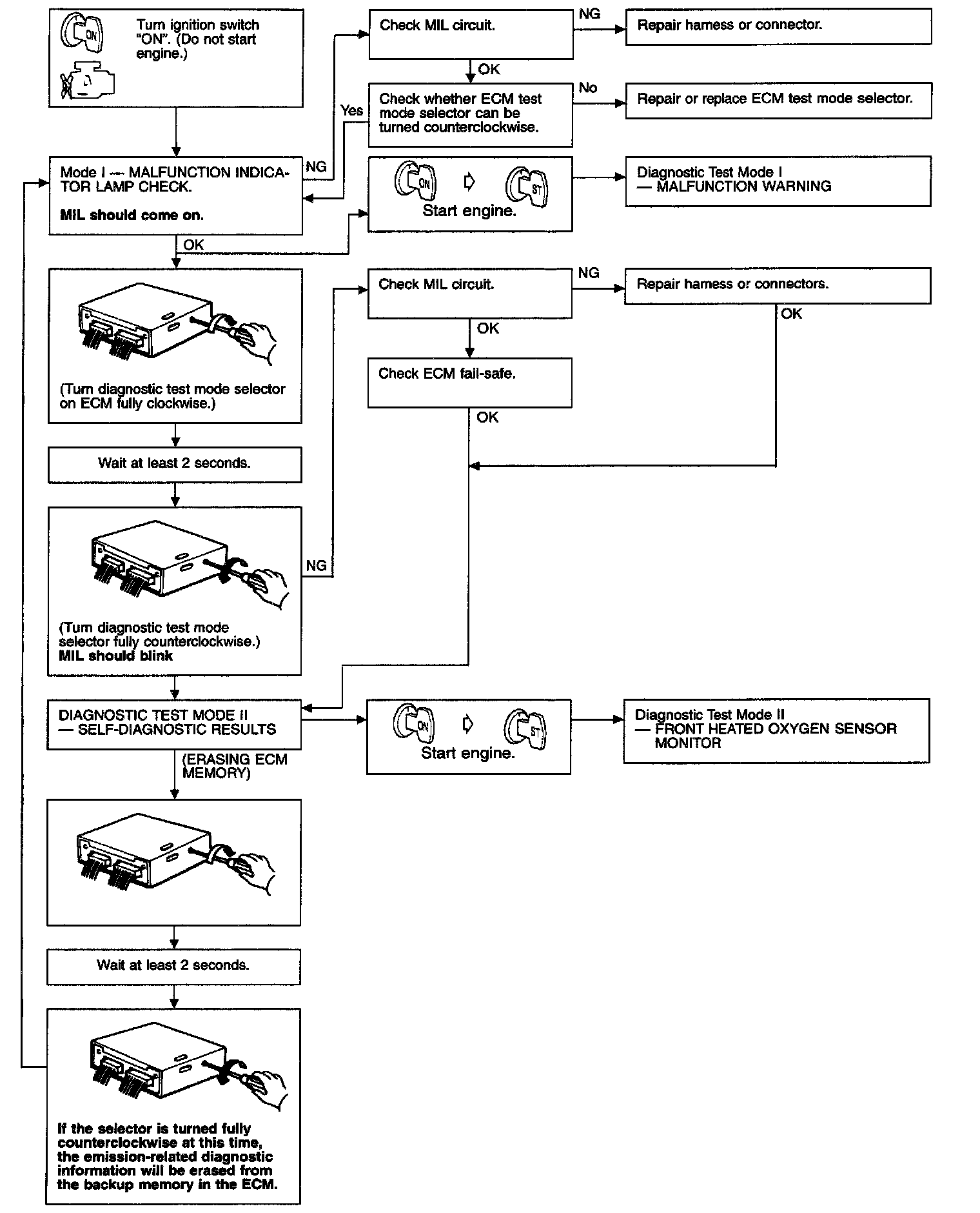 If the ECM is in Diagnostic Test Mode II, MIL may flash when engine is running. In this case, check ECM test mode selector following "HOW TO SWITCH DIAGNOSTIC TEST MODES".