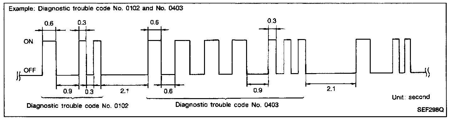 Long (0.6 second) blinking indicates the two LH digits of number and short (0.3 second) blinking indicates the two RH digits of number. For example, the malfunction indicator lamp blinks 10 times for 6 seconds (0.6 sec x 10 times) and then it blinks three times for about 1 second (0.3 sec x 3 times). This indicates the DTC "1003" and refers to the malfunction of the neutral position switch.