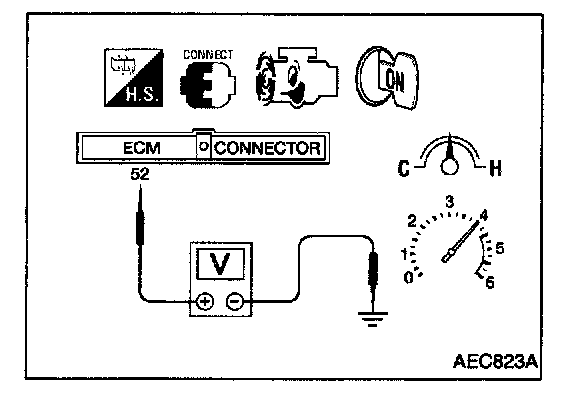 3. Set voltmeter probes between ECM terminals (52)(sensor signal) and engine ground.