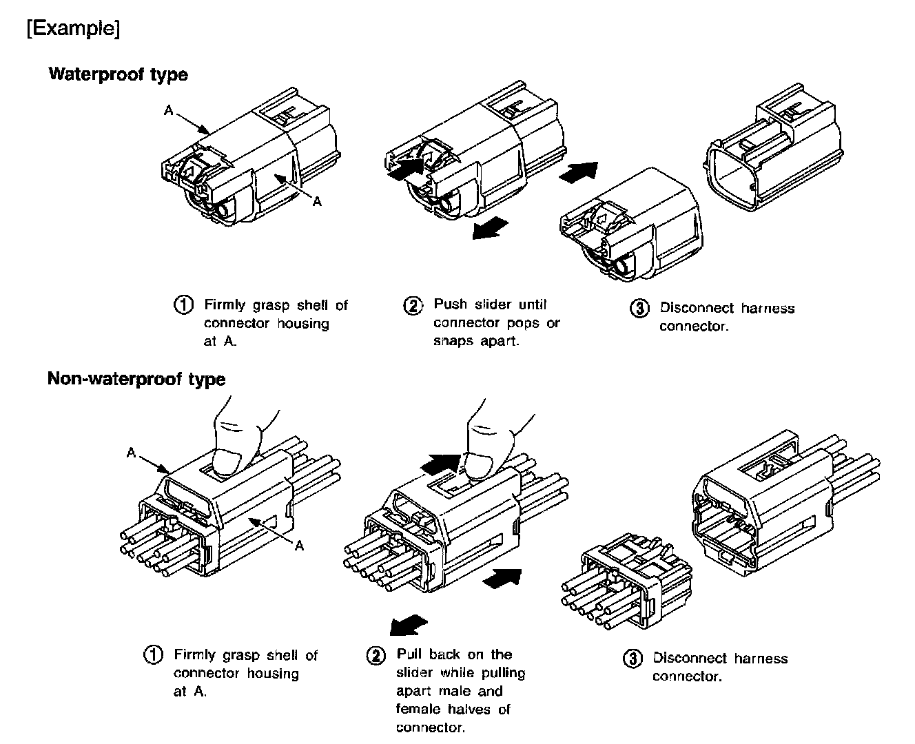 - Do not pull the harness or wires when disconnecting the connector.