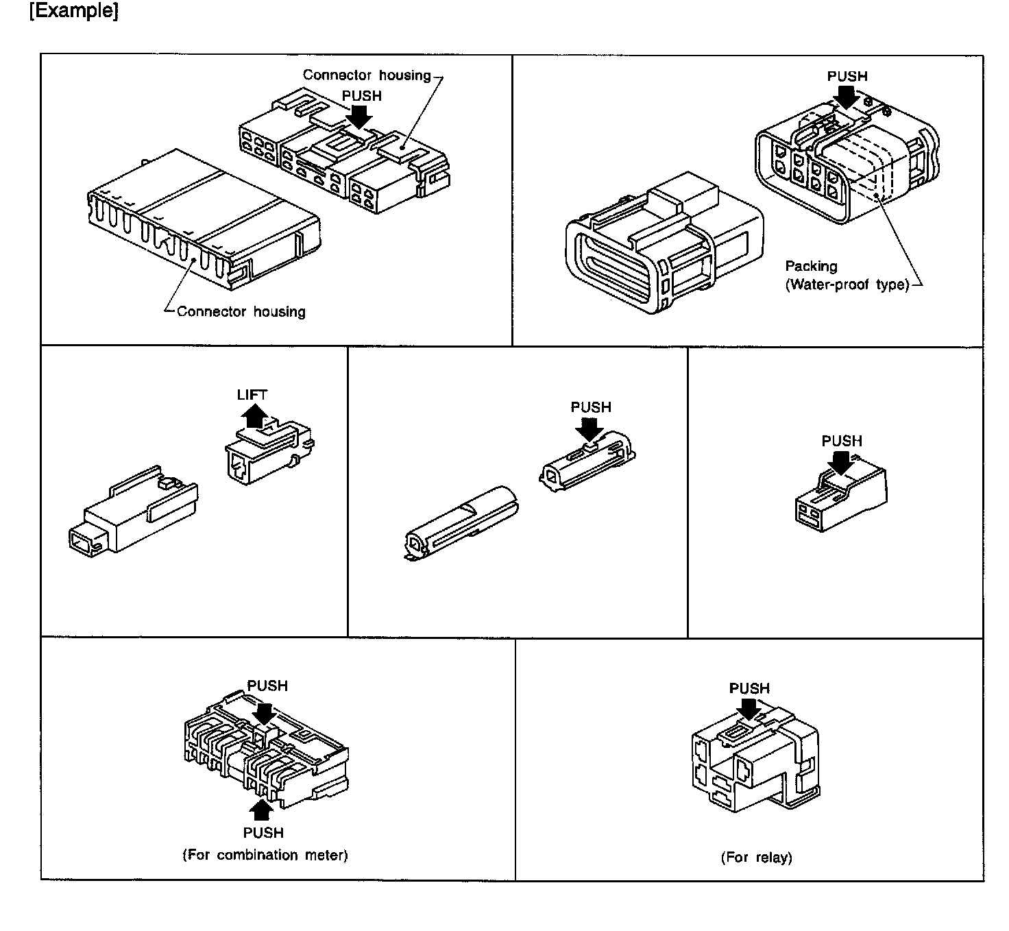 - The tab-locking type connectors are disconnected by pushing or lifting the locking tab(s). Refer to the illustration below.
