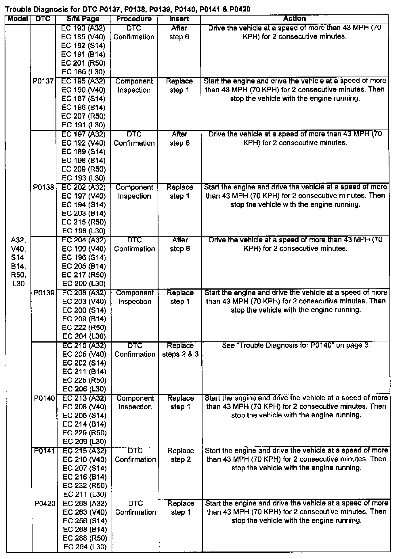 SERVICE MANUAL PROCEDURE CHANGE FOR REAR OXYGEN SENSOR DTC(S) P0137, P0138, P0139, P0140, P0141 AND THREE-WAY CATALYST DTC P0420