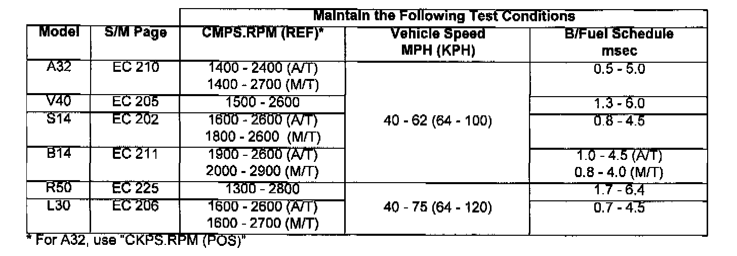 "Start the engine and drive the vehicle at a speed of more than 43 MPH (70 KPH) for 2 consecutive minutes." (2) replace step three with the specifications listed in the chart.