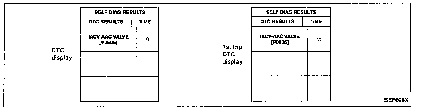 A sample of CONSULT-II display for DTC is shown below. DTC or 1st trip DTC of a malfunction is displayed in SELF-DIAGNOSTIC RESULTS mode of CONSULT-II. Time data indicates how many times the vehicle was driven after the last detection of a DTC.