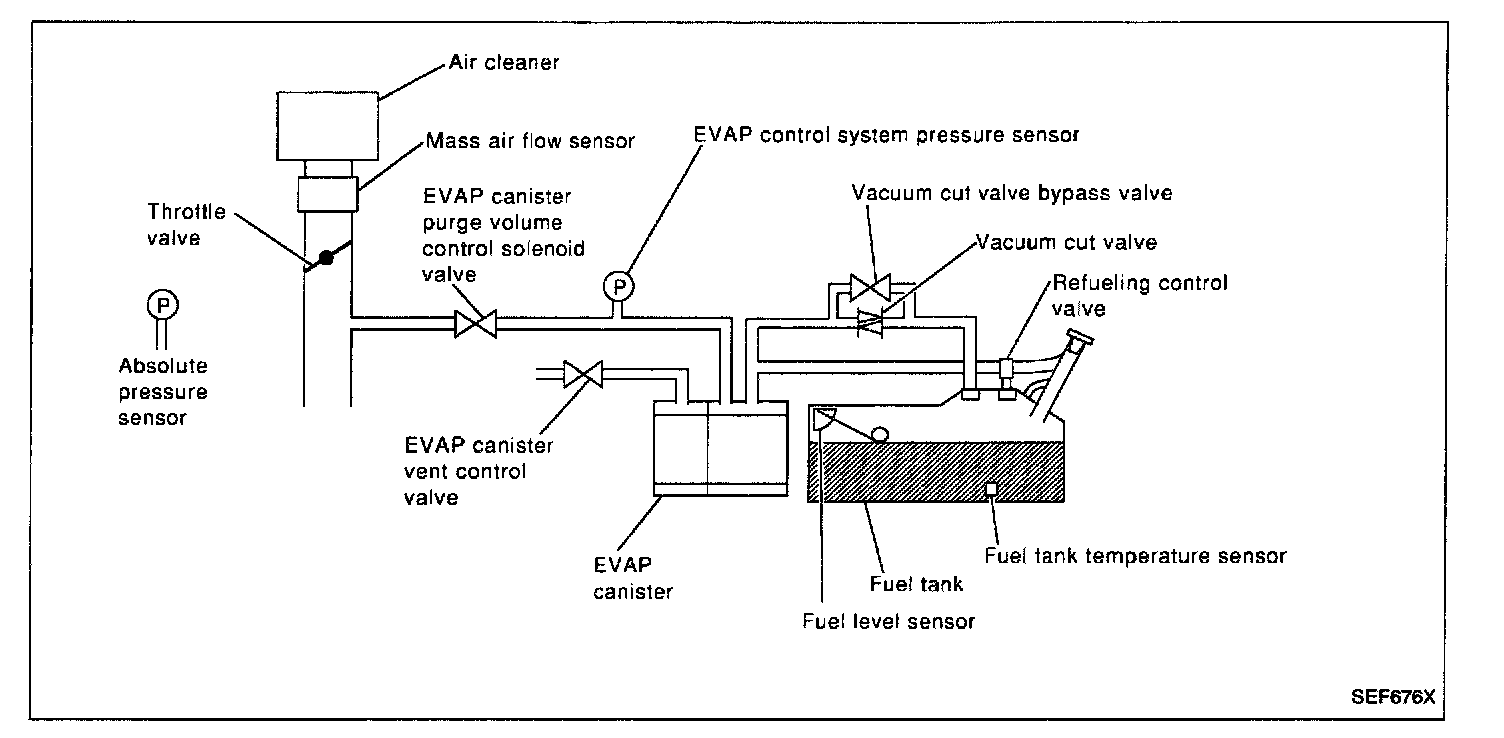 In this evaporative emission (EVAP) control system, purge flow occurs during non-closed throttle conditions. Purge volume is related to air intake volume. Under normal purge conditions (non-closed throttle), the EVAP canister purge volume control solenoid valve is open. Purge flow exposes the EVAP control system pressure sensor to intake manifold vacuum.
