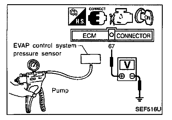 4. Use pump to apply vacuum and pressure to EVAP control system pressure sensor as shown in figure.
