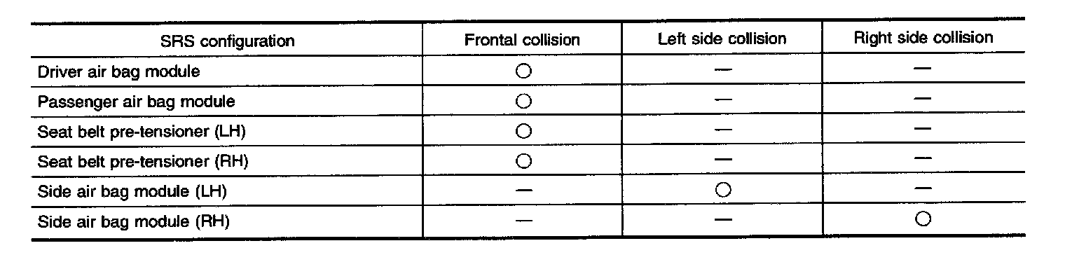 The collision modes for which supplemental restraint systems are activated are different among the SRS systems. For example, the driver air bag module and passenger air bag module are activated in a frontal collision but not in a side collision.