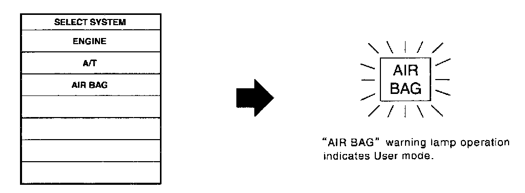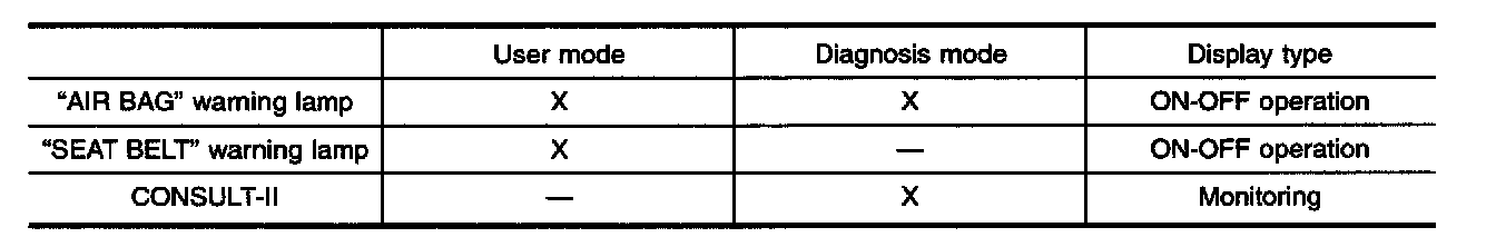 The SRS self-diagnosis results can be read by using the "AIR BAG" warning lamp and/or CONSULT II. The reading of these results is accomplished using one of two modes - "User mode" and "Diagnosis mode". The User mode is exclusively prepared for the customer (driver). This mode warns the driver of a system malfunction through the operation of the "AIR BAG" warning lamp.