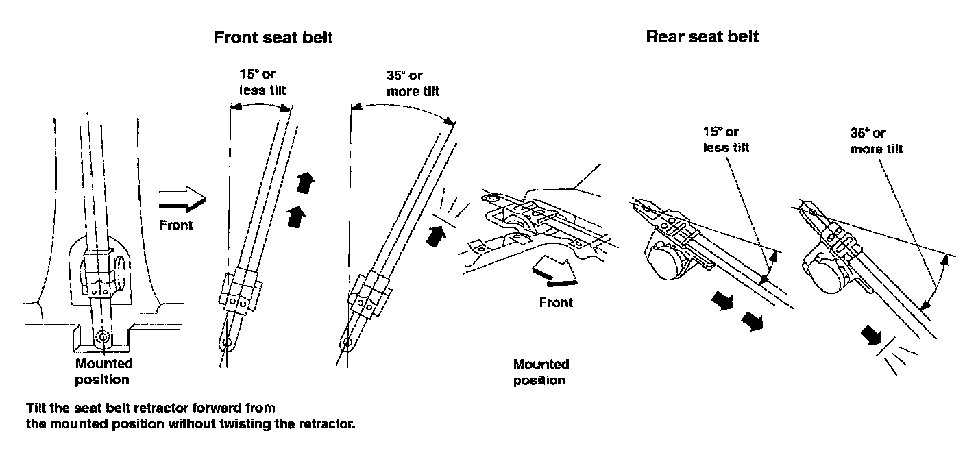 1. Remove the seat belt retractor assembly.2. Slowly pull out belt while tilting the retractor assembly forward from the mounted position without twisting the retractor assembly as shown in the illustration.