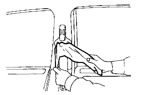 b. Allow the seat belt to retract. Ensure that belt returns smoothly and completely into the retractor. If the seat belt does not returns smoothly, wipe the inside of the loops with a clean paper cloth etc. because dirt built up in the loops of the upper anchors can cause the seat belts to retractor slowly.