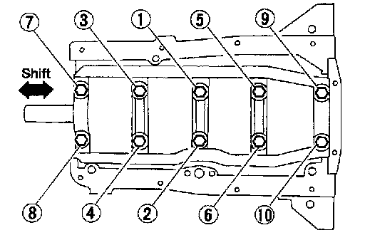 Tighten bearing cap bolts gradually in two or three stages. Start with center bearing and move outward as shown in figure.