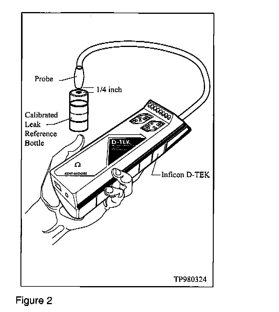 5. To calibrate the D-TEK, slowly pass the probe tip about... of an inch over the leak reference bottle, moving the probe about 1 - 2 inches per second to detect a leak rate of 0.5 ounces per year (see Figure 2). The alarm will sound and several yellow lamps will illuminate. Once the yellow lamps go out, the unit will have an audible click (about 2 clicks per second) which indicates the D-TEK is ready to use.
