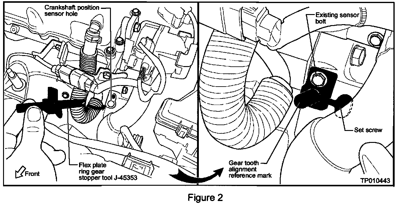 ^ The new tool can be easily installed in the crankshaft position sensor hole in the bell housing. Refer to the Service Procedure for instructions on installing this new tool.