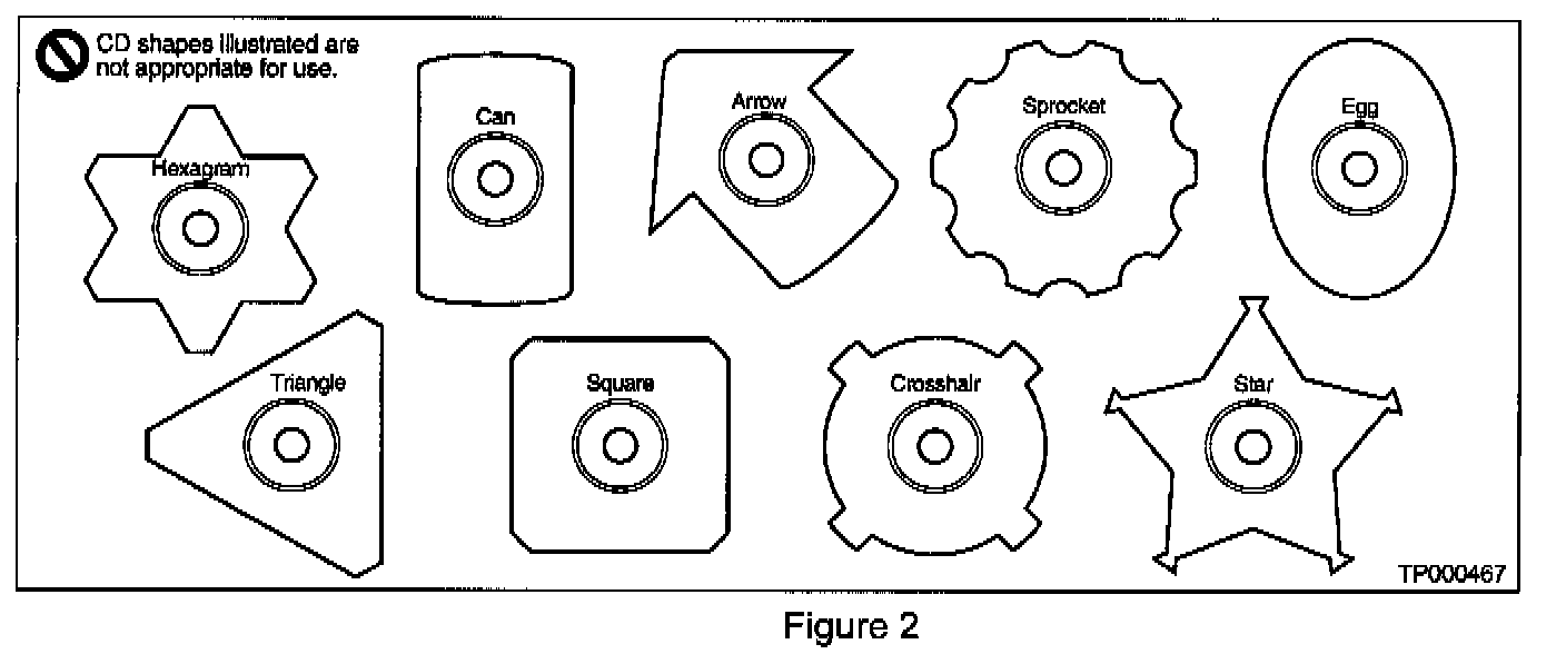 ^ Customers must not use special shaped CDs (see Figure 2). The Audio CD system was designed to use standard 12 cm (4.7 in) round CDs. Other shapes and sizes may cause the internal CD mechanism to jam or have optical pick-up errors.