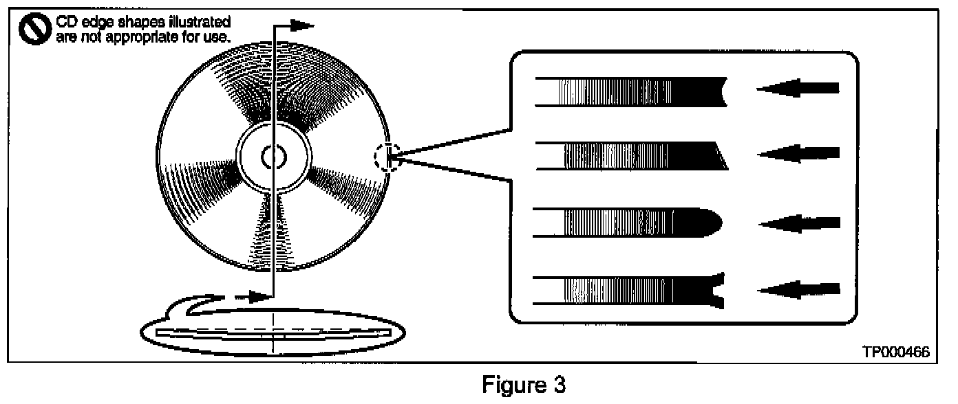 ^ Customers must not use CDs that are warped, scratched, have abnormal edges or are otherwise damaged (see Figure 3). Damaged CDs may cause the internal CD mechanism to jam or have optical pick-up errors.