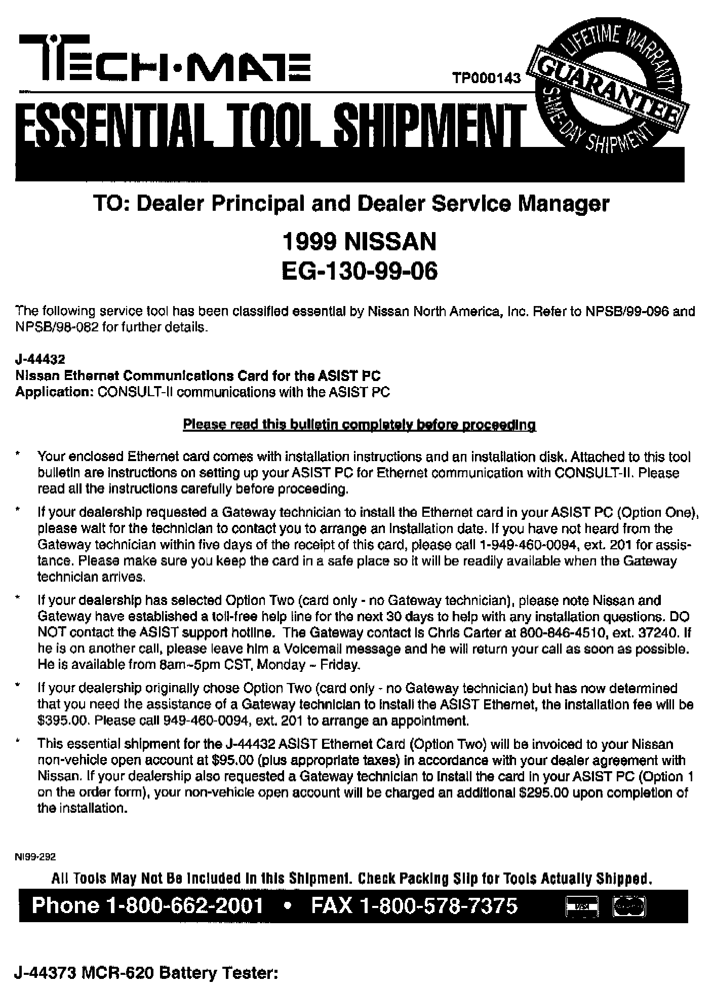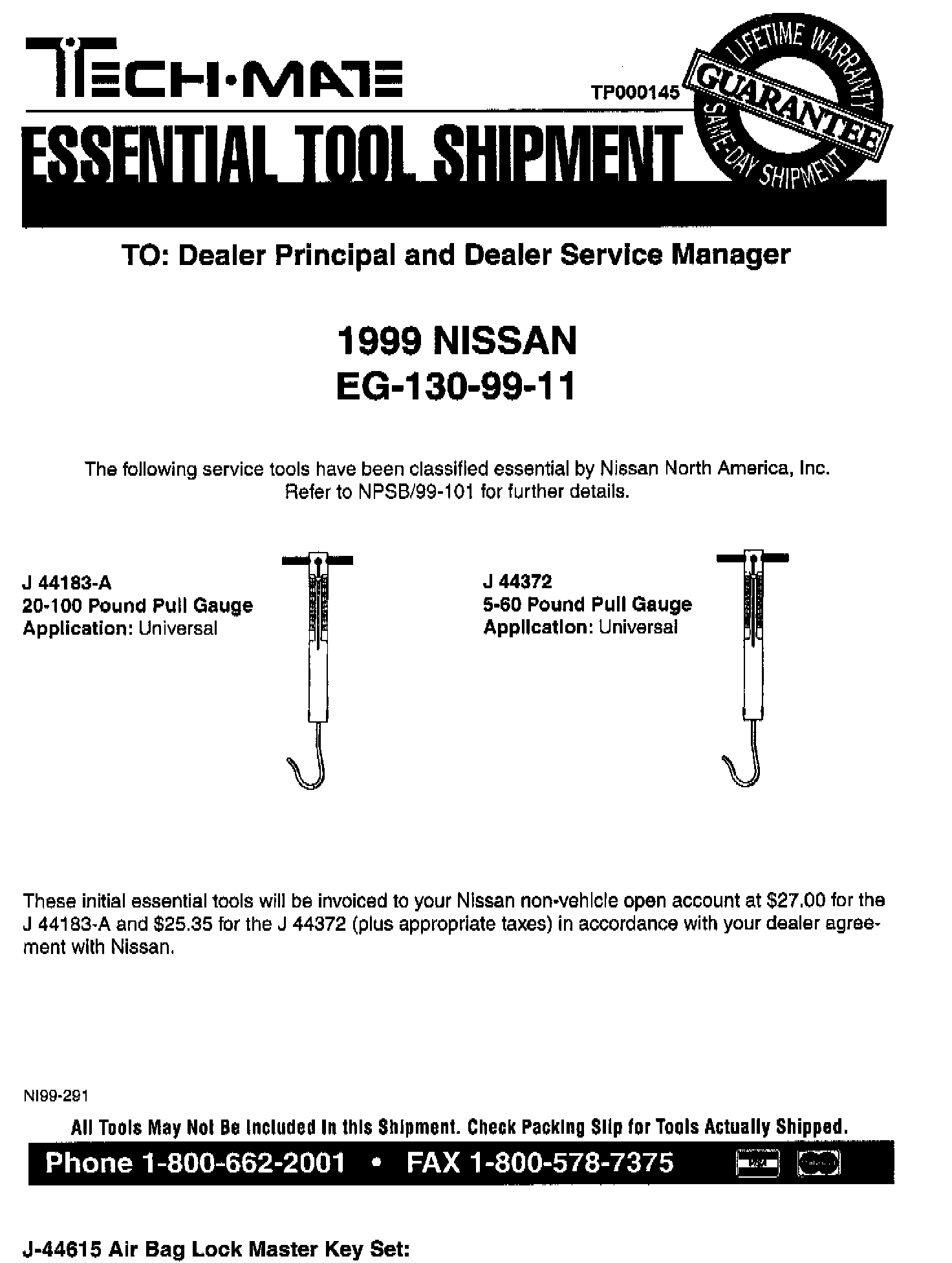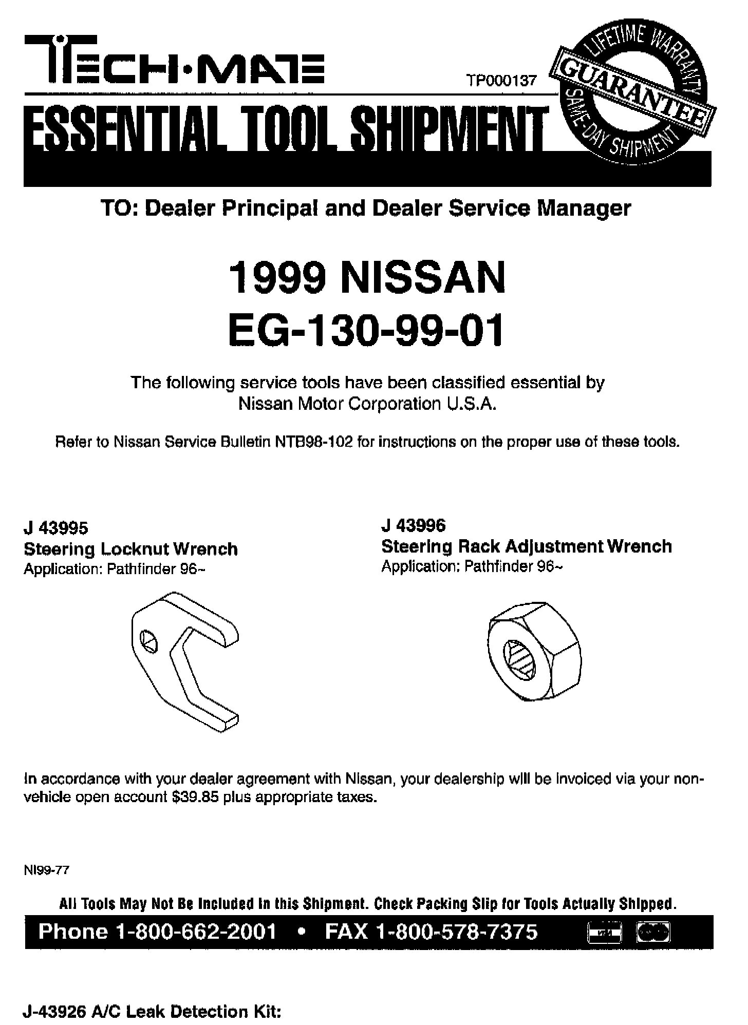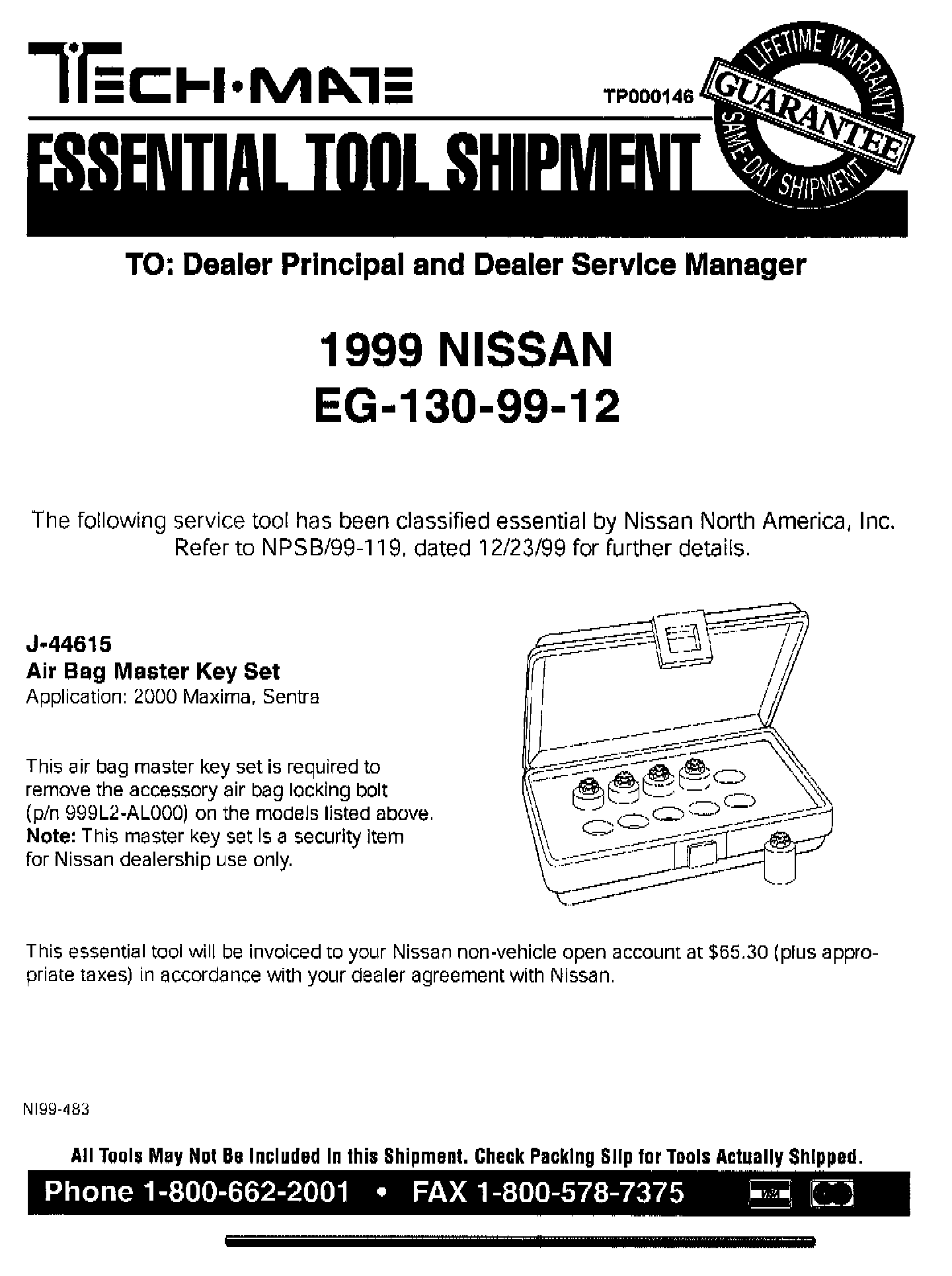 NISSAN 1999 ESSENTIAL TOOL SHIPMENT SUMMARY