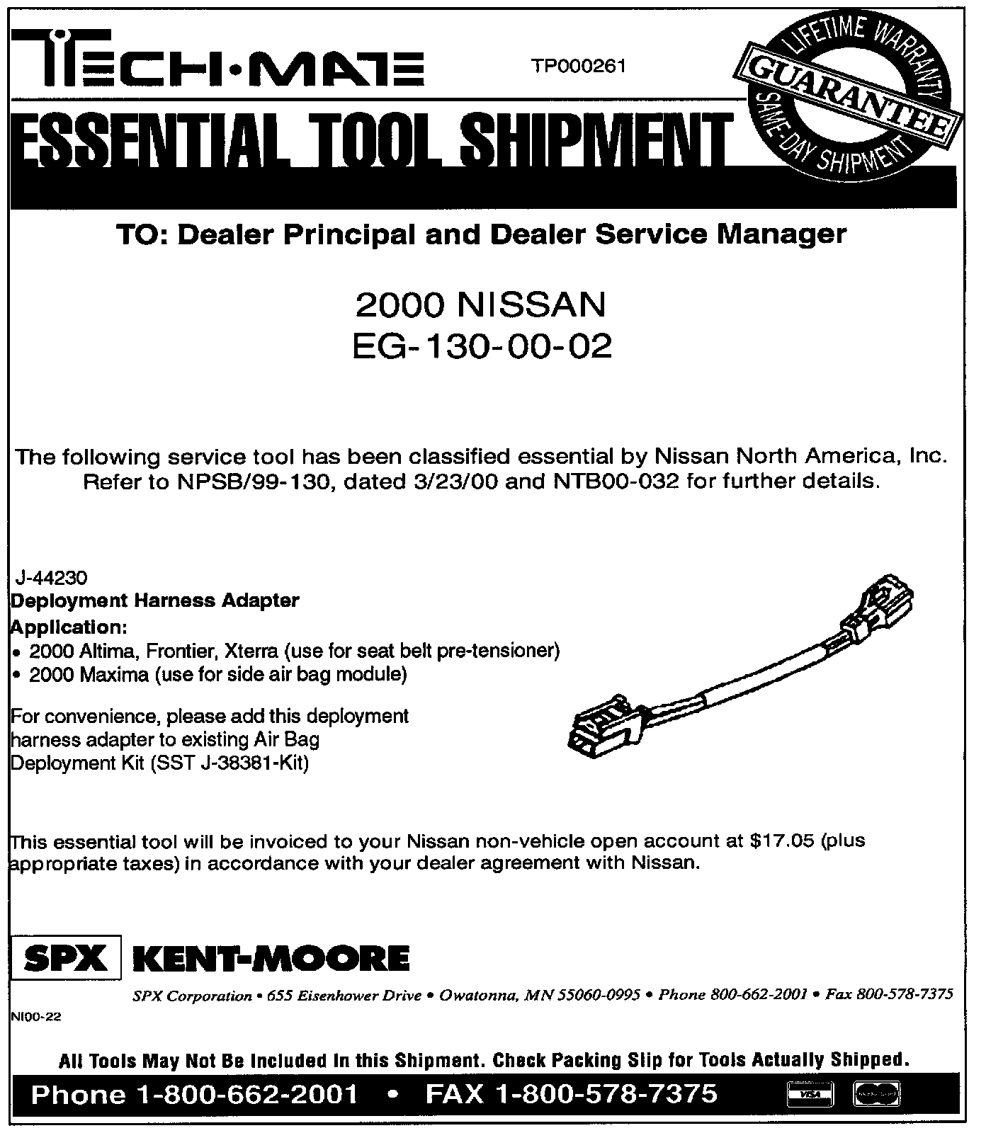 This new adapter harness will be shipped to Nissan Dealers as an essential tool and should be stored with the Deployment Tool kit J-38381-KIT when not in use. See the Tech-Mate flyer shown for additional information.
