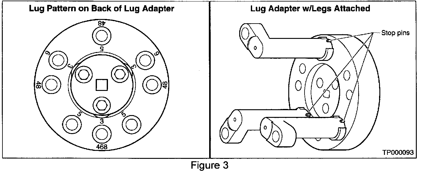 4. Assemble the legs on the lug adapter according to the lug pattern of the vehicle being worked on (see Figure 3). Then tighten the bolts that secure the legs to the adapter, making sure the legs are flat against the adapter and freely rotate.