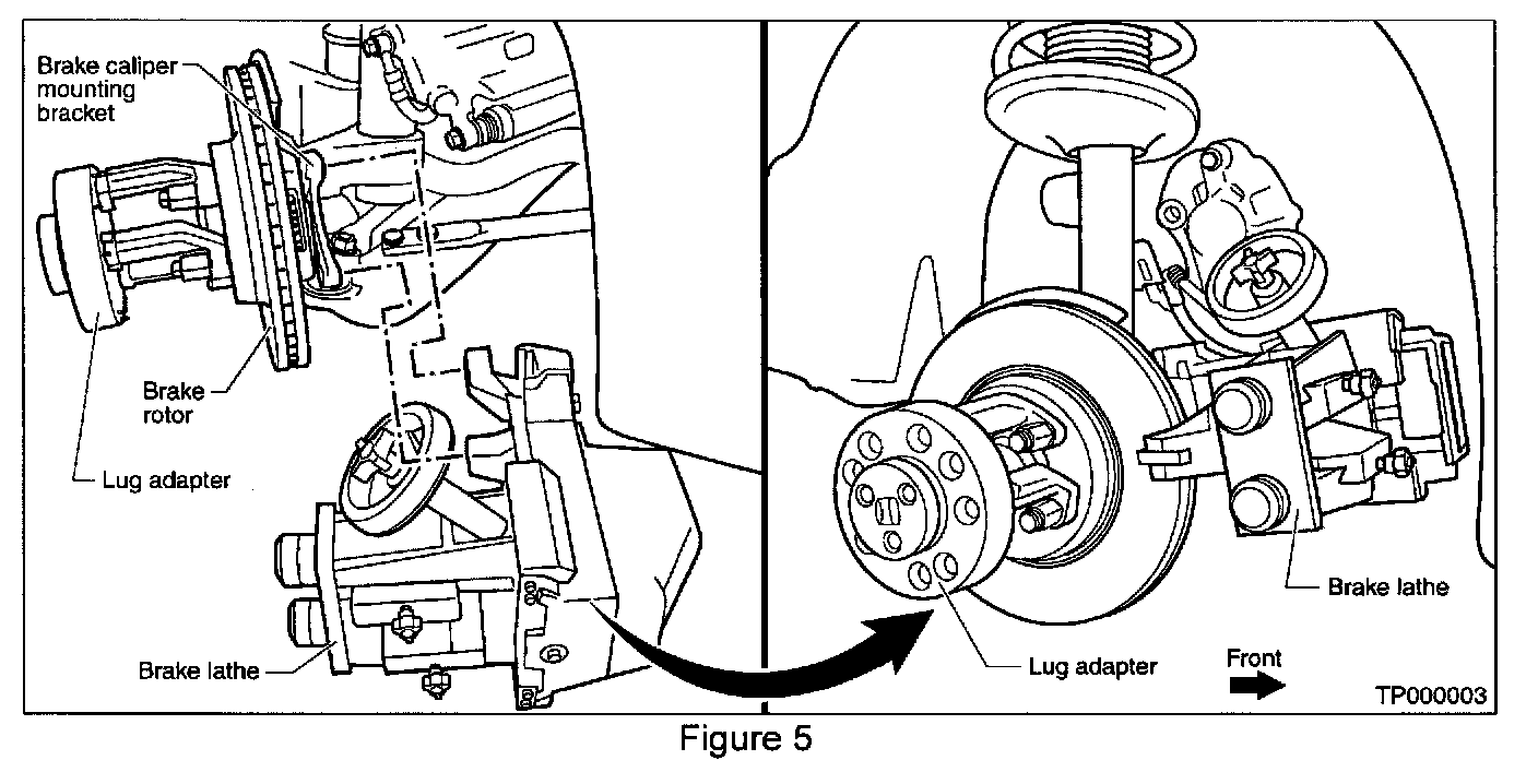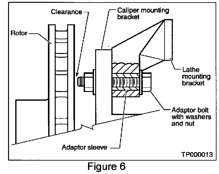Use the appropriate adapter mounting bolts and sleeves to ensure the lathe is firmly mounted and that NO movement (play) exists between the caliper mounting bracket and the lathe. Also, make sure there is sufficient clearance between the adapter mounting bolts and the brake rotor (see Figure 6).