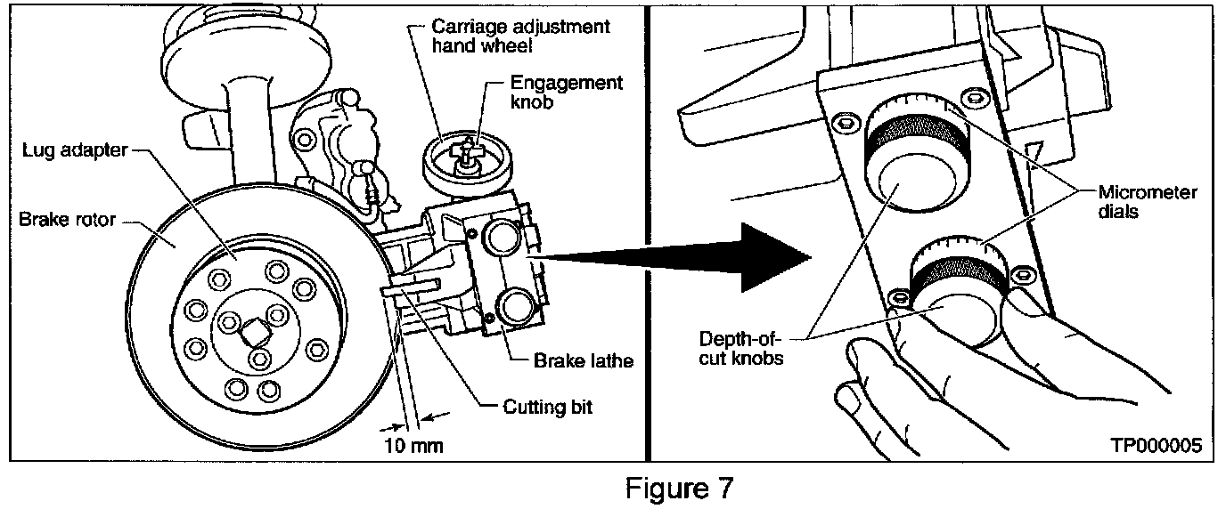 Do not cut below the minimum rotor thickness specification. Replace the rotor if the run-out cannot be eliminated without exceeding the minimum rotor thickness specification.