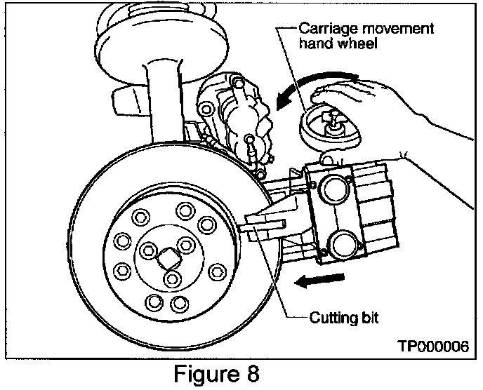 12. Advance the carriage with the hand wheel until the outboard cutting bit reaches the inside edge of the rotor surface (see Figure 8). Then, advance the carriage movement hand wheel an additional one-third turn.