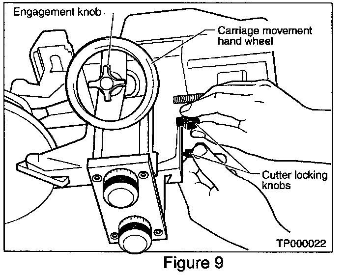 17. Tighten the engagement knob in the center of the carriage movement hand wheel (see Figure 9) to start the cutting process. When the cutting bits clear the outer edge of the rotor, loosen the engagement knob to stop the carriage movement.