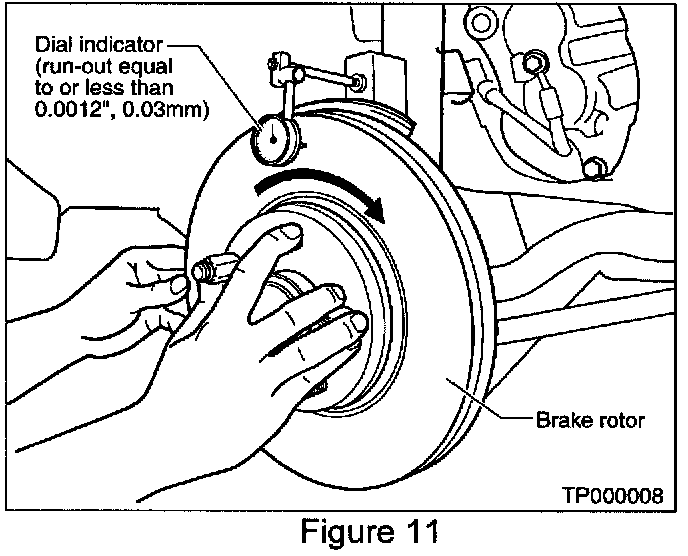 20. Use a dial indicator to ensure the rotor run-out is within specification (see Figure 11). Rotor run-out should not exceed 0.0012" (0.03 mm).