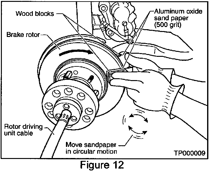 21. Turn the rotors and hand finish the newly turned rotor surface with a non-directional swirl pattern using #500 grit aluminum oxide sandpaper. This improves the rotor surface finish and helps to further reduce noise (see Figure 12).