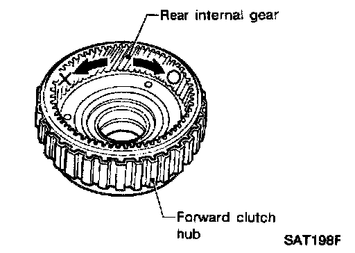 9. Hold forward clutch hub and turn rear internal gear. Check overrun clutch hub for correct directions of lock and unlock.