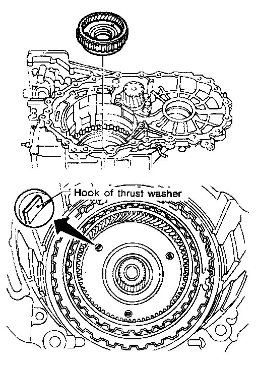- Check that three hooks of thrust washer are correctly aligned after installing.