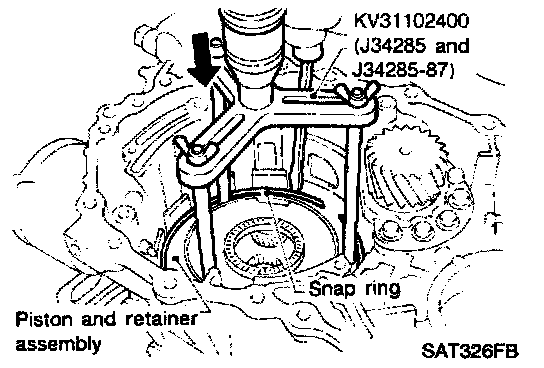 e. Push down piston and retainer assembly and install snap ring.